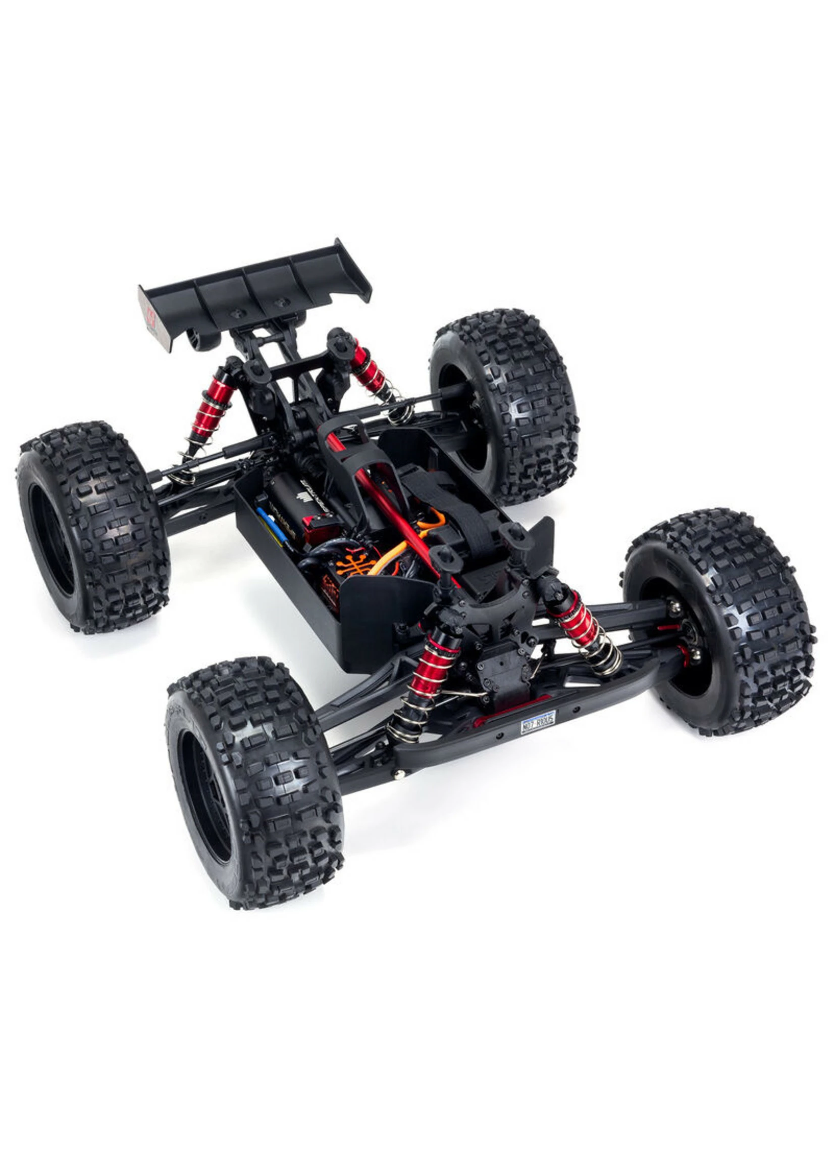 For the toughness needed to support extreme stunts, ARRMA® uses a strengthened anodized aluminum chassis as the foundation. A center body support and aluminum center brace plus composite chassis side pods add more durability. All-metal diff outdrives and gearbox internals plus durable steel driveshafts provide a reliable, heavy-duty drivetrain that holds up to extreme stunts and high-speed bashing. A “never loose” aluminum steering servo saver and “never pop” ball ends supply more precision, reliability and confidence.