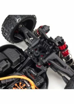 For the durability needed to support intense brushless performance, ARRMA® uses a strengthened, anodized aluminum chassis as its foundation. Front and rear composite chassis braces and composite chassis side pods add more toughness. All-metal diff outdrives and gearbox internals, plus durable steel driveshafts, all contribute to a reliable, heavy-duty drivetrain that holds up to extreme bashing. A “never loose” aluminum steering servo saver and “never pop” ball ends supply more precision, reliability and confidence.