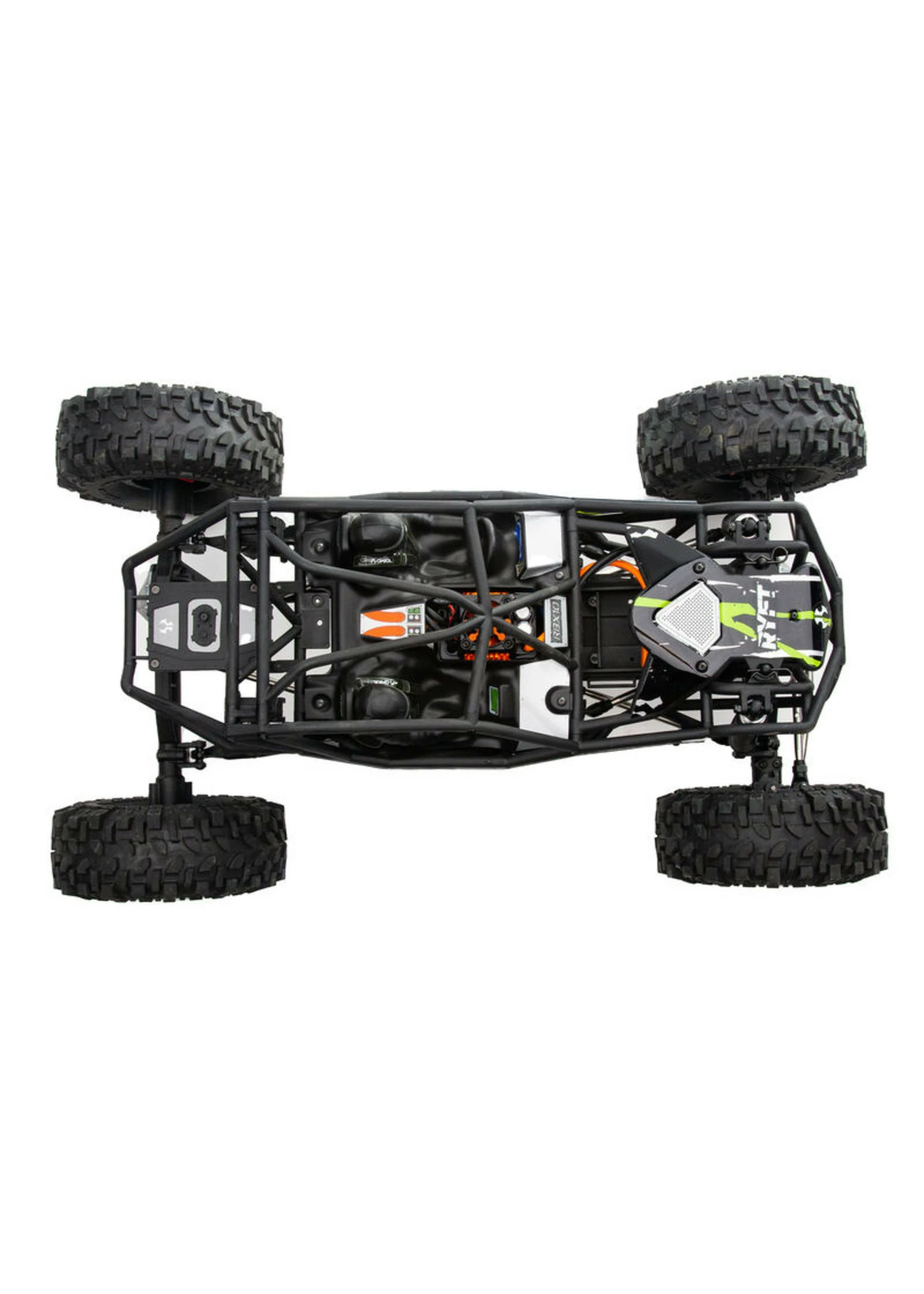 The Axial RBX10 Ryft 4WD 1/10 RTR Brushless Rock Bouncer features a custom high-strength composite plastic tube chassis engineered to withstand the hard knocks of RC rock bouncing. A strong 4S-capable high speed powertrain features a 2200Kv brushless motor, paired with a Spektrum Firma 130A ESC. Licensed Interco TSL Bogger tires on Raceline wheels, and long travel front/rear shocks are connected to molded plastic front and rear solid axles with metal differential covers. All the parts blend together to help tame wild terrain. These features, along with a full-time 4WD transmission, make the RBX10 Ryft a fun vehicle to send at full throttle.