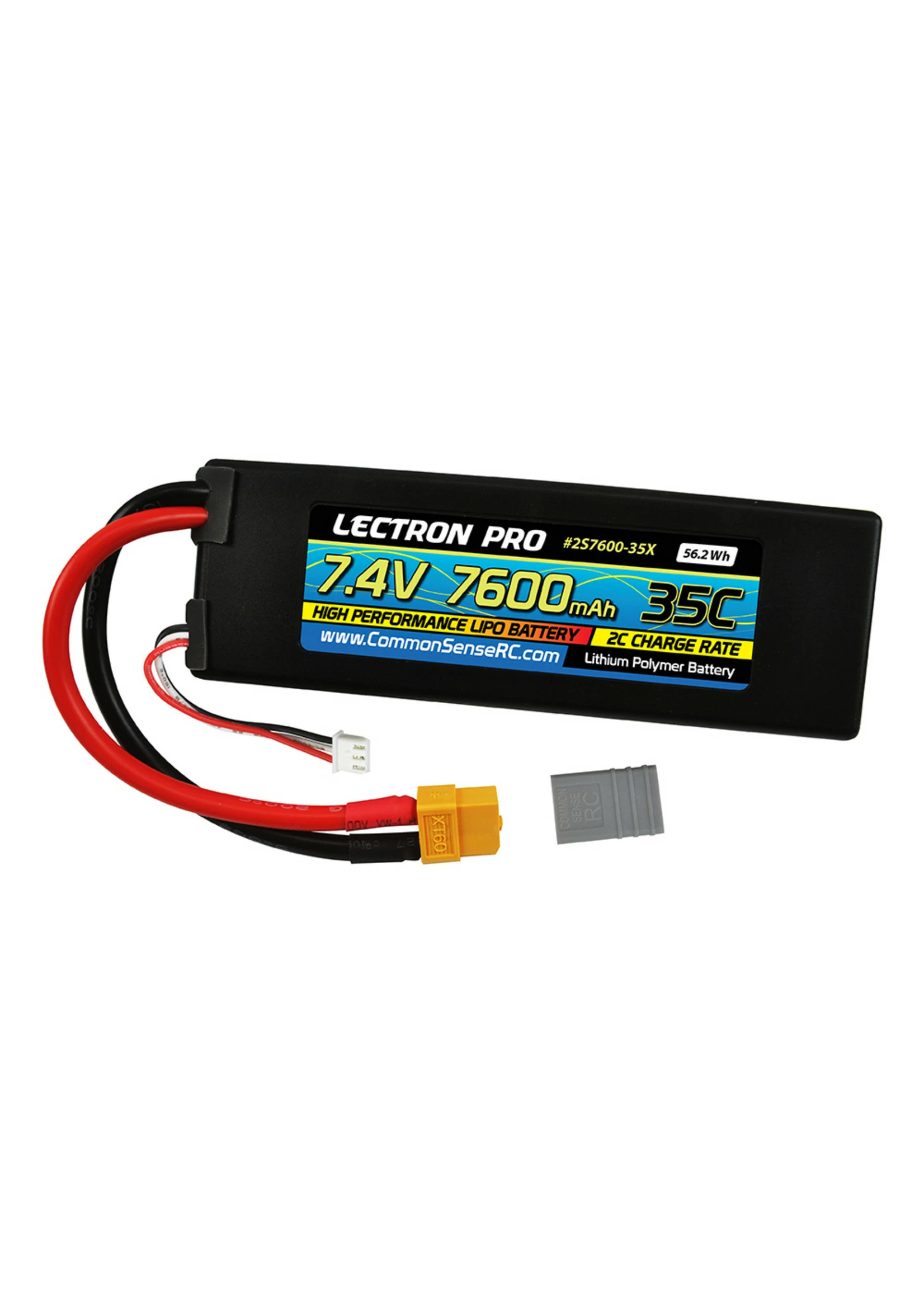 This 2-cell 7.4V 7600mAh 35C lipo is the same size as a standard 5000mAh lipo, perfect for 1/10 scale cars, trucks, and buggies! The huge 7600mah capacity means massively extended run times and the 35C continuous discharge rating means you’ll get great punch and top-end speed. Includes an XT60 connector on the discharge leads plus a Common Sense RCâ„¢ adapter to convert XT60 connectors for use with popular RC vehicles.