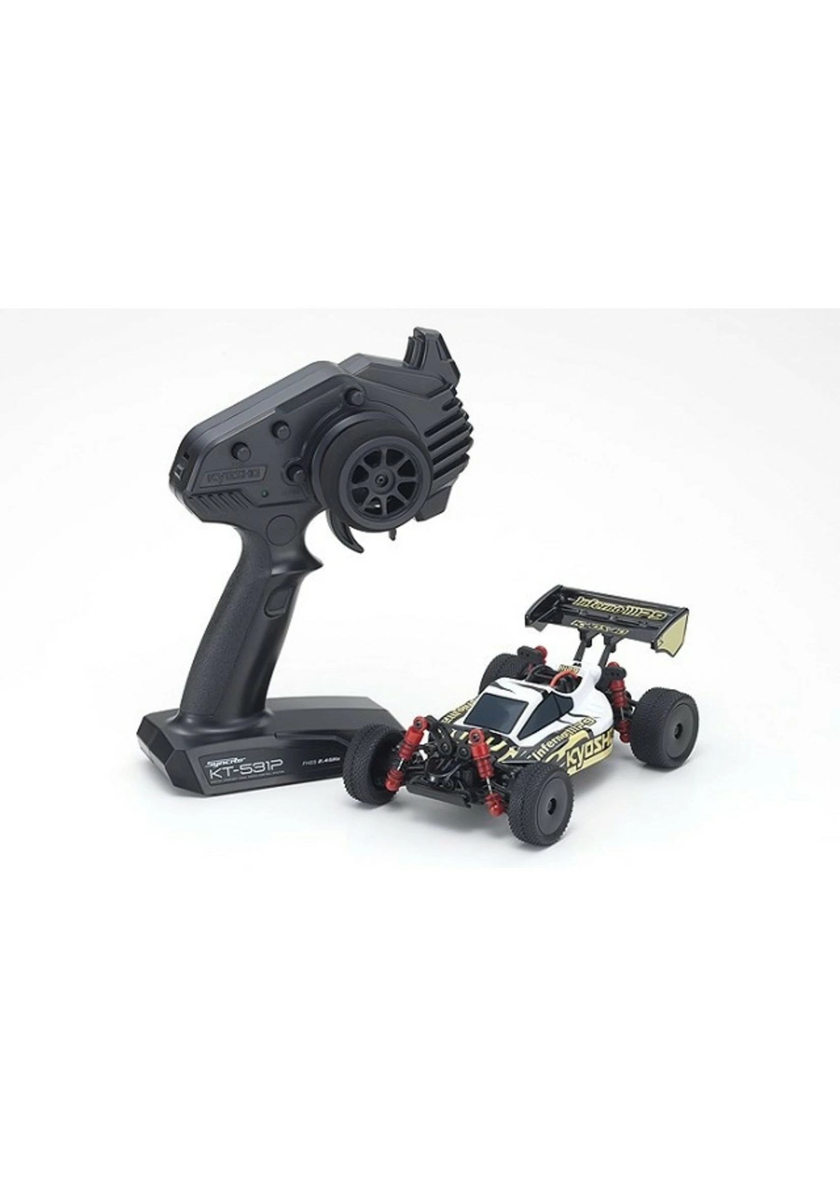 Simply add eight AAA-size alkaline batteries to this Readyset and the MINI-Z Buggy brings the fun of R/C car action. The advanced compact design includes 4WD drive train with slipper clutch to protect the gear system, and 4-wheel independent double wishbone suspension with oil-filled shocks to deliver true racing buggy performance. Most critical components are protected within the high-rigidity dustproof chassis shell. 7-stage geared steering servo provides plenty of torque for precision steering response and combines with the control program to deliver the MINI-Zβs signature linear handling and light feel. The circuit board also features manual volume adjustment for the optional gyro unit (sold separately) that stabilizes straight line running and improves cornering control. Modeled on the popular Inferno MP9, the MINI-Z buggy body matches performance with style featuring a distinctive new printed color scheme complimented by black wheels for the sharpest looking machine on the track. The fully pre-assembled Readyset package makes it simple and enjoyable for anyone to experience advanced R/C buggy performance, whether itβs your first car or as fun-driving second car