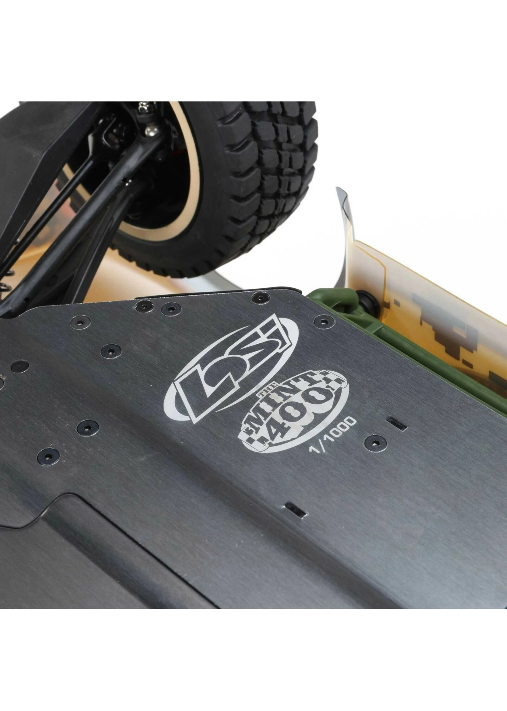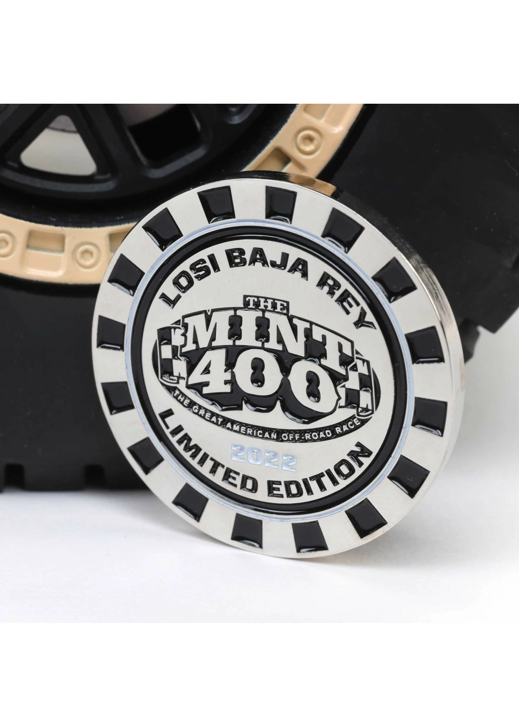 The Losi® Ford Raptor Baja Rey® 2022 Mint 400 Limited Edition RTR is a way for off-road enthusiasts to own a piece of Losi and Mint 400 history. It comes equipped with a Spektrum™ Firma 3800Kv brushless power system, as well as a solid rear axle, independent front suspension, and appropriate suspension geometry, so you can tear across all types of desert off-road terrain. The Baja Rey® Mint 400 Limited Edition includes officially licensed Ford Raptor body panels and licensed Black Rhino wheels adding to the scale details. You get an authentic off-road racing experience with a 4WD drivetrain with metal geared and sealed (front and center) differentials, Spektrum high torque metal gear servo, and front and rear light bars. The box includes a one-of-a-kind metal alloy painted coin to add to your collection as an item to be forever cherished. With this Limited Edition Baja Rey, you can skim across the whoops of the proving grounds, reach top speed across Jean Lake, and take advantage of 4WD across the loose silt at Chokers, just like the actual race trucks racing the Mint 400.