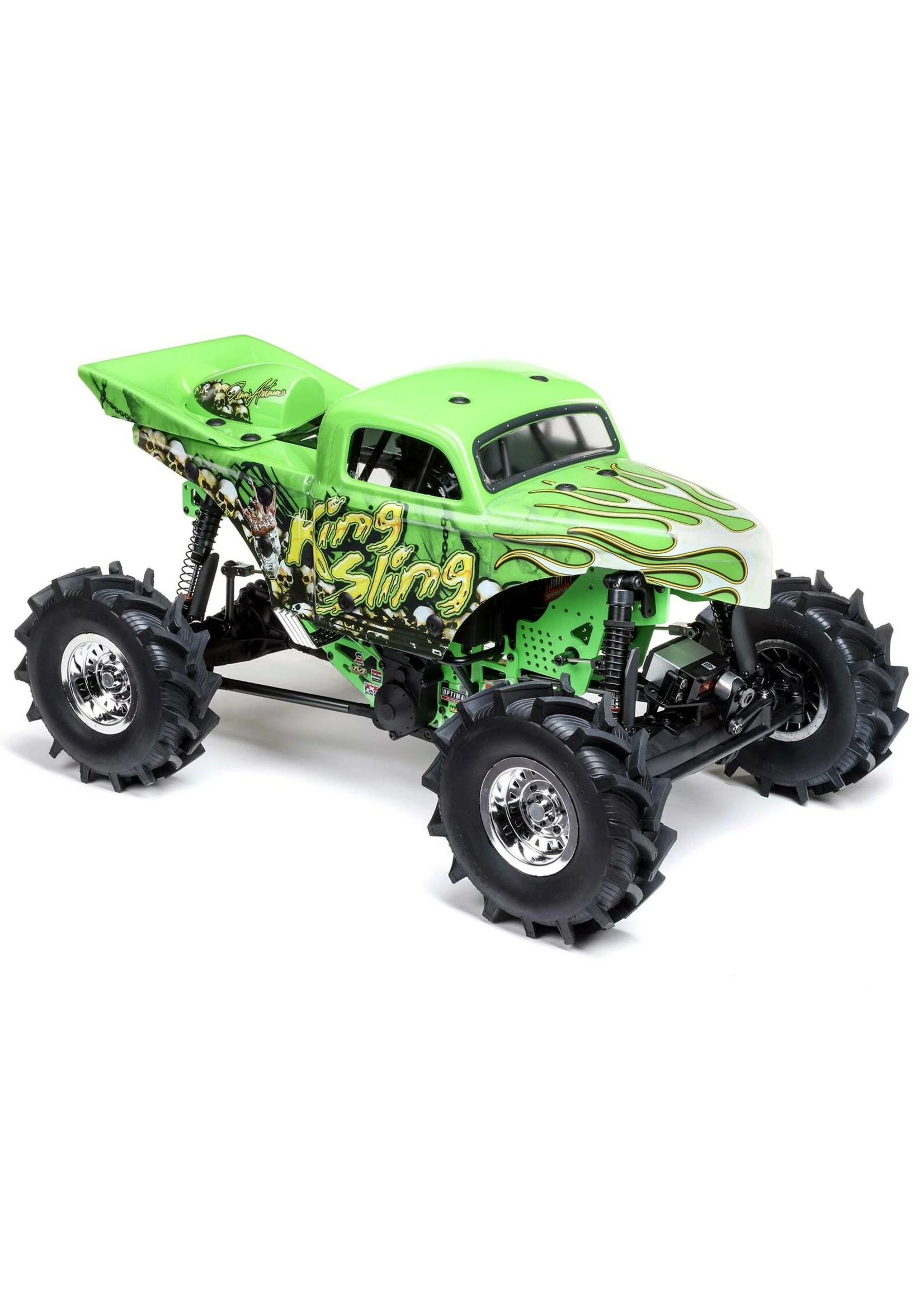 New, ready-to-run Losi® Mega 4WD trucks with officially licensed Bog Hog and King Sling bodies deliver an experience unlike any other Losi product. Mega trucks resemble monster trucks but use a specific size of tractor tire that allows them to tackle mud bogs, make large jumps, and pound through the nastiest terrain. The Losi Mega truck is a combination of everything drivers want — it’s overpowered, overbuilt, and ready to throw mud everywhere!