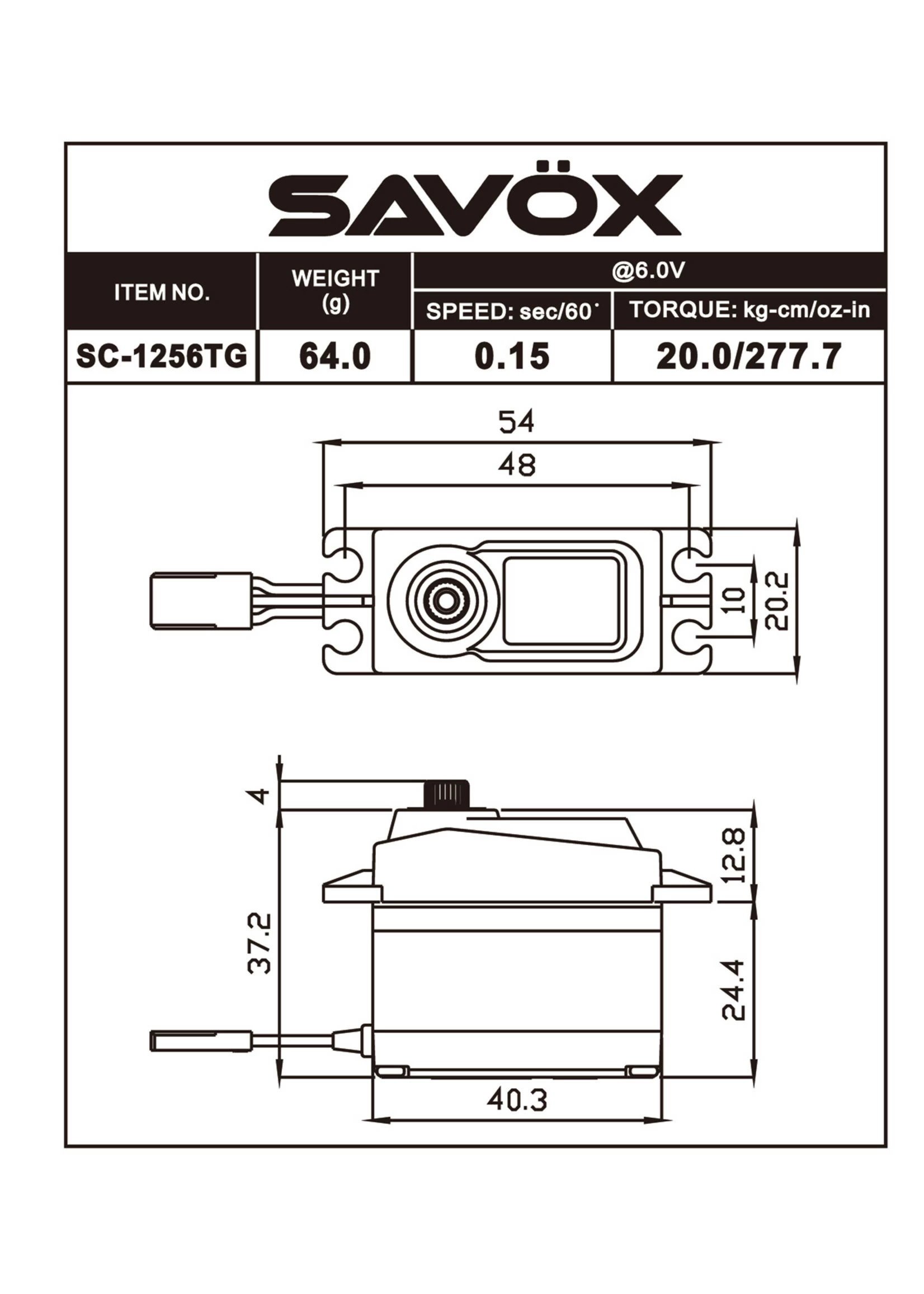- Torque @ 6v – 20.0kg/277.7oz-in