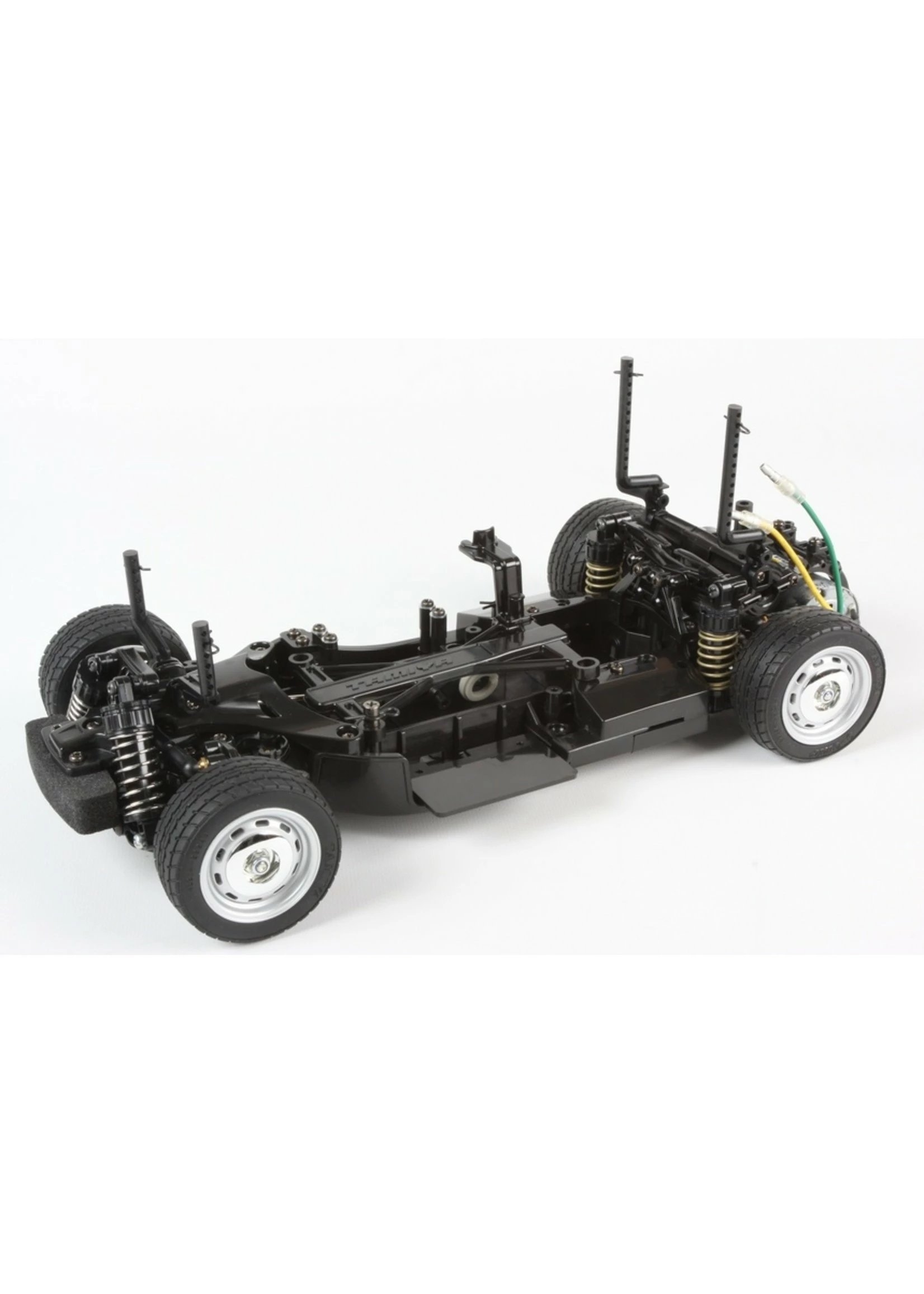 The M-06 chassis features a Rear-Mounted Motor, Rear-Drive setup and features a longitudinally-mounted battery pack, with R/C units positioned on either side for optimum balance and a low center of gravity. 4-wheel double wishbone suspension uses metal-plated wheels exactly like those on the real car, equipped with 60D radial tires at the front and 60D super grip tires at the rear. In addition, a 3-piece steering linkage offers nimble handling response.