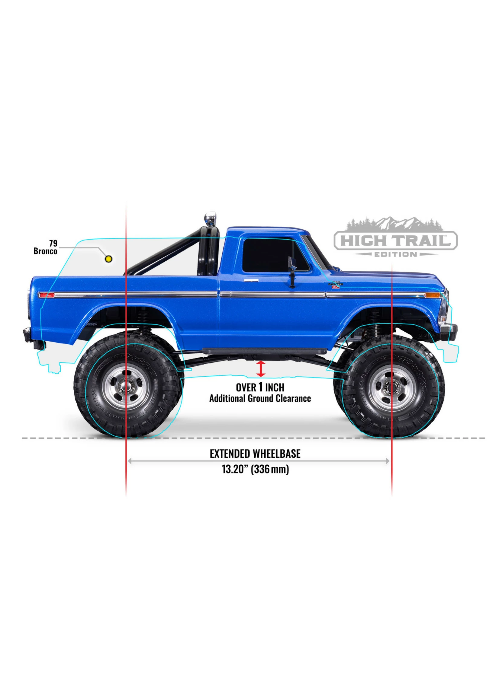 TRX-4® 1979 Ford® F-150® Ranger XLT is the latest truck to receive the High Trail Edition treatment with its striking replica body and high-riding stance. High Trail Edition trucks take adventure to new heights with factory-installed Long Arm Lift Kits and oversize tires to raise ground clearance over an inch higher than standard TRX-4s. The F-150 Ranger’s extended wheelbase further enhances TRX-4’s already legendary off-road capability for even more fun on the trail. TRX-4 F-150 High Trail Edition is the perfect vehicle for the driver who wants it all: extreme all-terrain capability, stunning scale looks, and Traxxas-Tough™ durability.