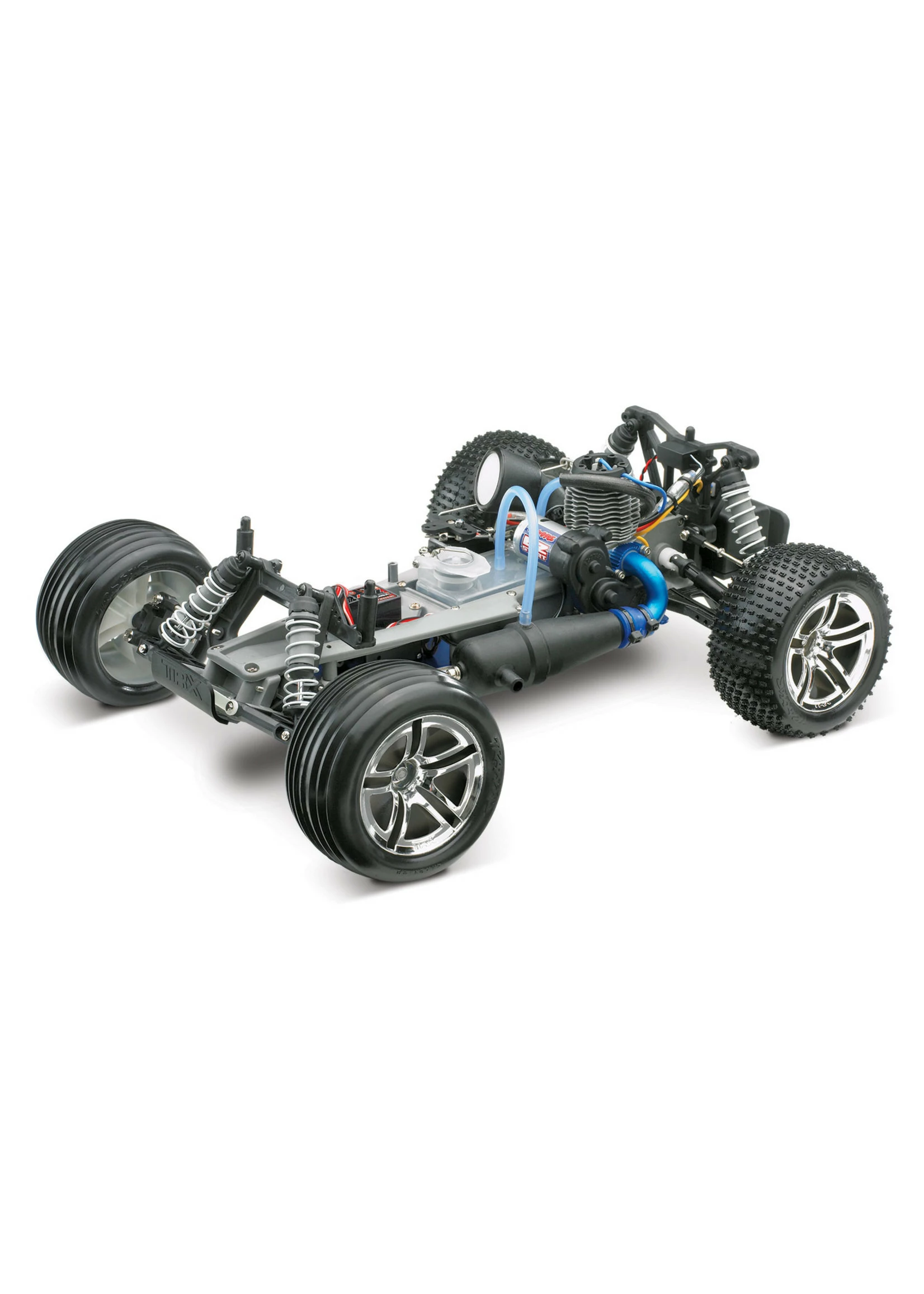The Nitro Rustler is the first name in high performance 2WD nitro stadium trucks. Powered by the proven performance of the TRX 2.5 Racing Engine, Nitro Rustler totally out-muscles the competition with top speeds beyond 50 mph! The TRX 2.5 also pumps out the torque for brutal, wheel-standing launches and absolutely ruthless acceleration. The sleek body design cheats the wind with its smooth curves and low-slung stance, while the outrageous graphics dominate with style. The separate wing securely bolts to the body with precise aluminum hex hardware. Chrome 2.8 Twin Spoke⢠rims are wrapped with pre-glued Alias⢠step-pin tires in the rear and Alias⢠ribbed tires up front. The high-tech rubber compound ensures great grip on a variety of surfaces. Grey-molded composite parts are thoughtfully integrated to enhance the look of the chassis. Fast, light, and loaded with power, Nitro Rustler’s power-sliding, dirt roosting attitude will have you reaching for the throttle again and again.