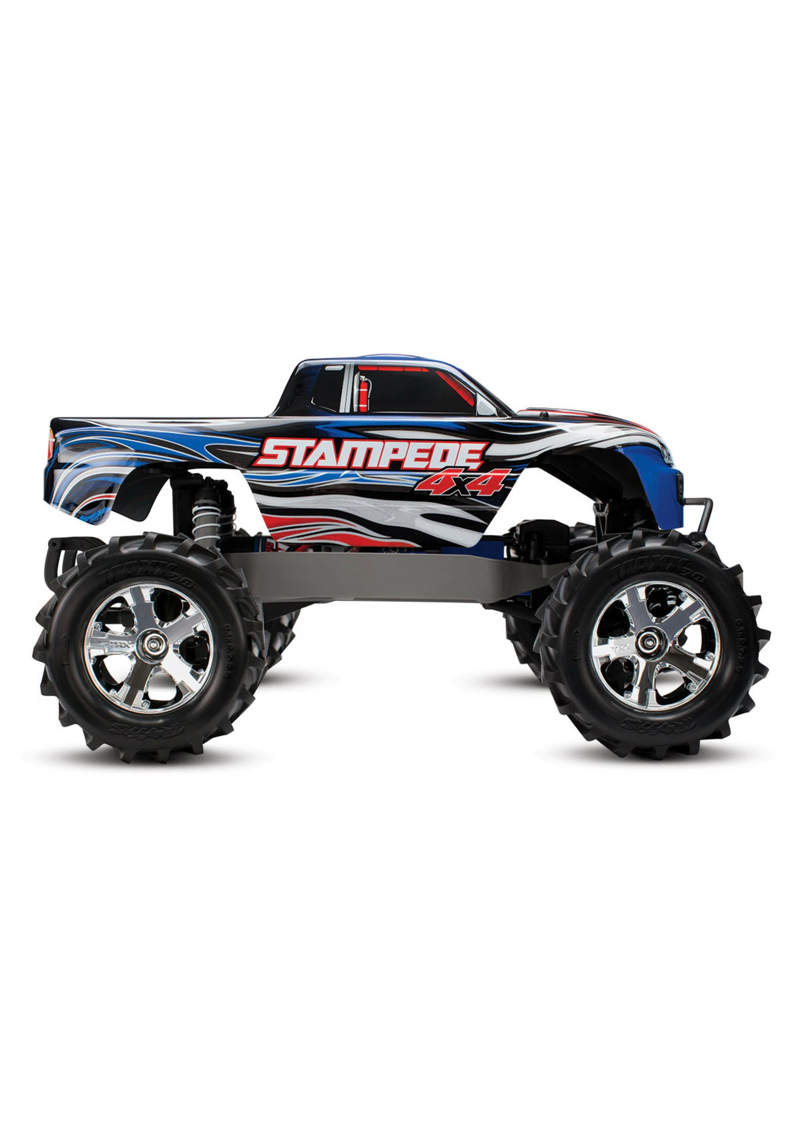 Speed, style, versatility, and fun…Stampede 4X4 has it all! The Stampede 4X4 is built Traxxas Toughâ„¢ to withstand all the 4-wheel drive monster mayhem you can dish out. Its tall, drive-over-anything ground clearance and ultra-tough, long-arm suspension make Stampede 4X4 feel nearly indestructible. Chrome All-Starâ„¢ 2.8″ wheels give Stampede 4X4 aggressive style, and soft Chevron Maxxâ„¢ tires deliver true multi-terrain capability. The XL-5 ESC and Titan 550 motor dish out plenty of driving excitement. It’s all waterproof, so the fun keeps going through all kinds of wet conditions! No other truck offers Stampede 4X4’s unique style, capability, and reputation for durability. Stampede 4X4 is perfect for almost any age driver or skill level and comes fully assembled, painted, and Ready-to-Drive® with included 8.4V NiMH battery pack and charger.