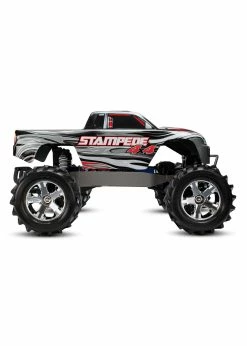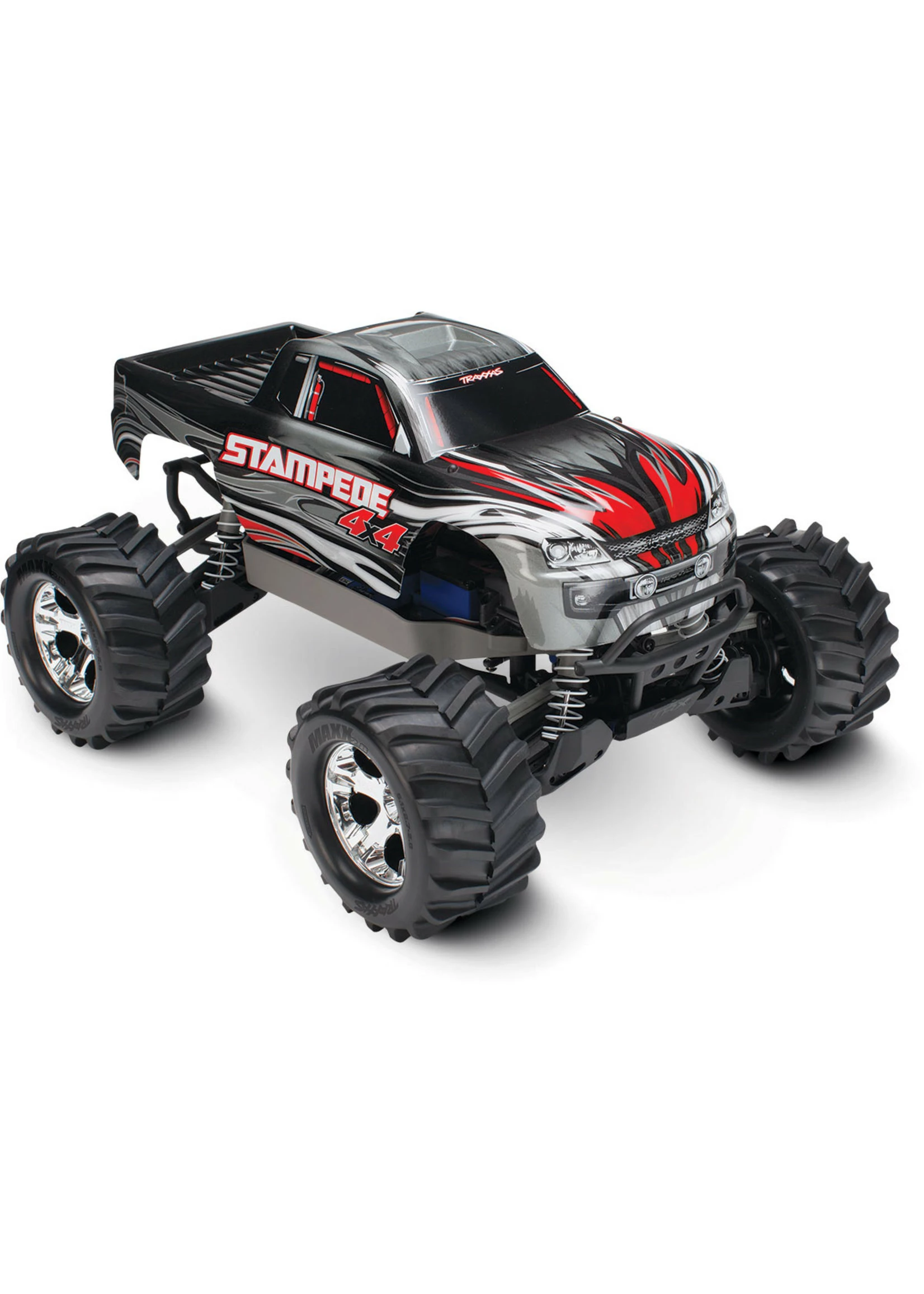 Stampede 4X4 is built on the proven performance of the advanced shaft-driven 4WD system and innovative modular design of the award-winning Slash 4X4. The chassis fully integrates the electronics and battery compartment for an efficient and compact layout, and maintains the high center ground clearance that gives Stampede its monster stance and high-riding look. The extra clearance drastically increases the off-road versatility that allows you to tackle rougher terrain and bigger obstacles. The Stampede 4X4 feels planted and secure at speed, even on pavement and in other high-grip conditions. Stampede 4X4 is 100% monster truck, but it handles like a racing machine!